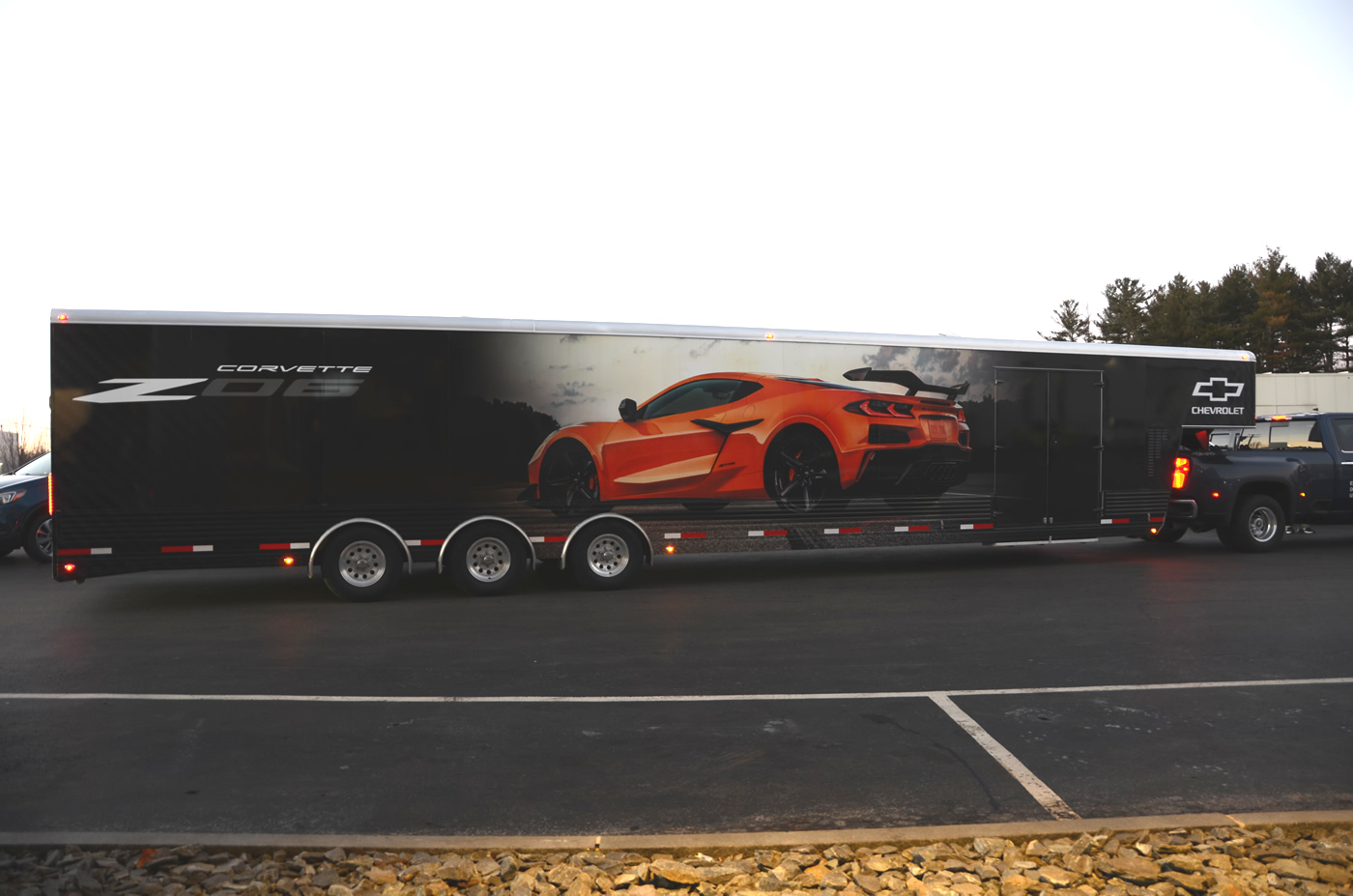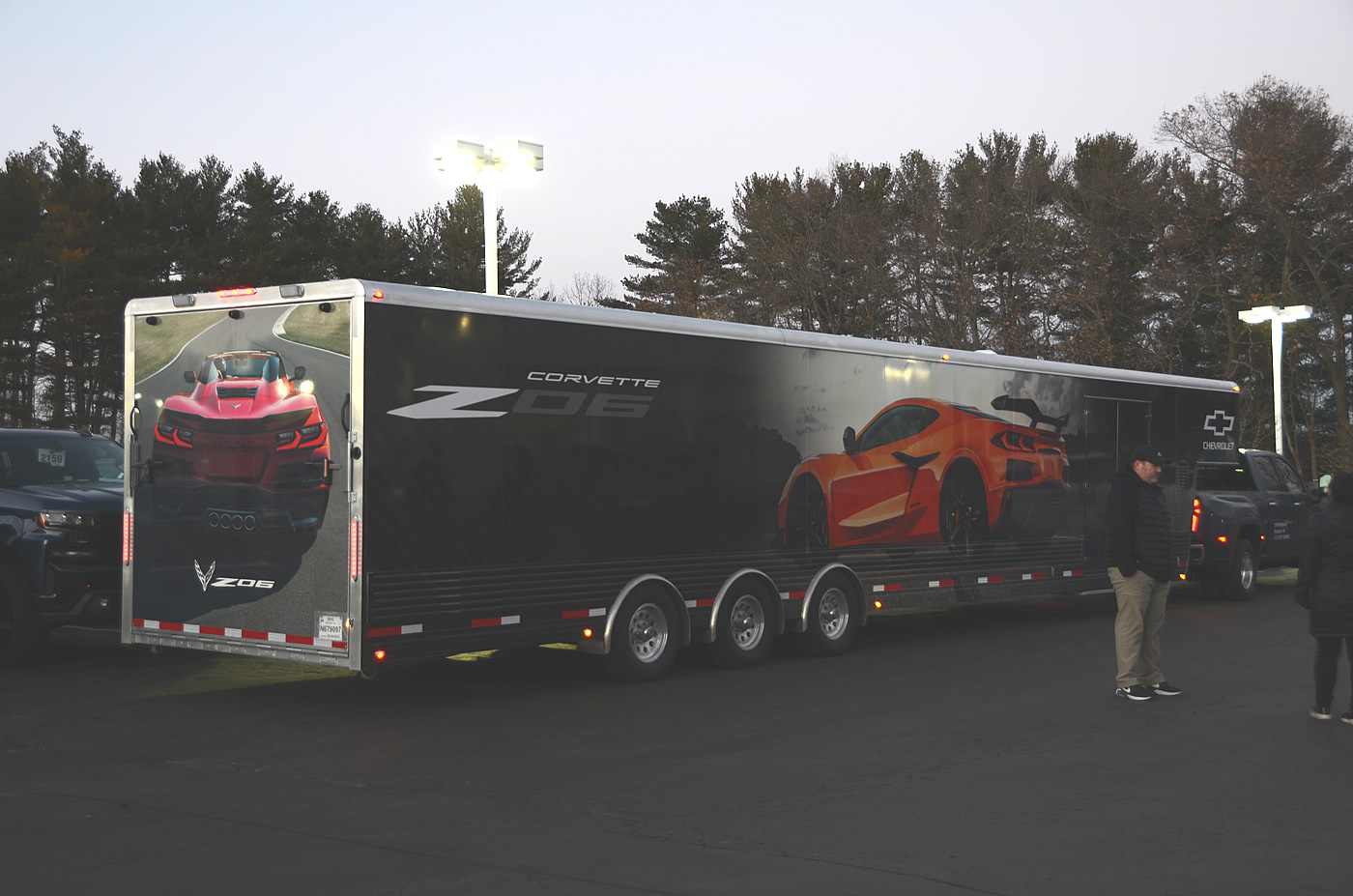 As the sun had just set behind the hills in New Hampshire last night, the Z06 tour trailer pulled into the dealership lot and we were there to capture the arrival. Unfortunately, with the diminishing light and a digital camera that refused to cooperate, we were only able to grab a few photos worth posting until this morning…