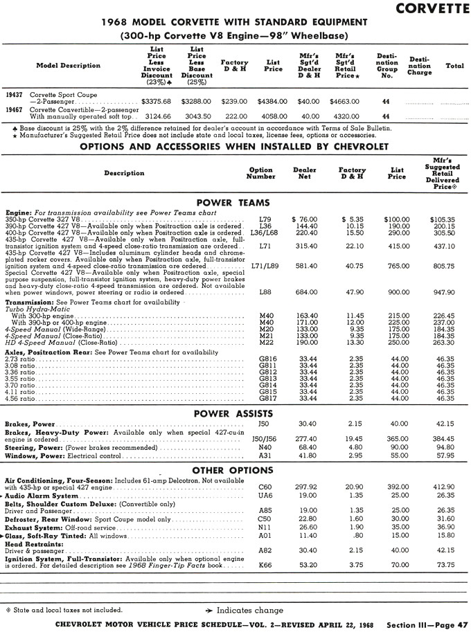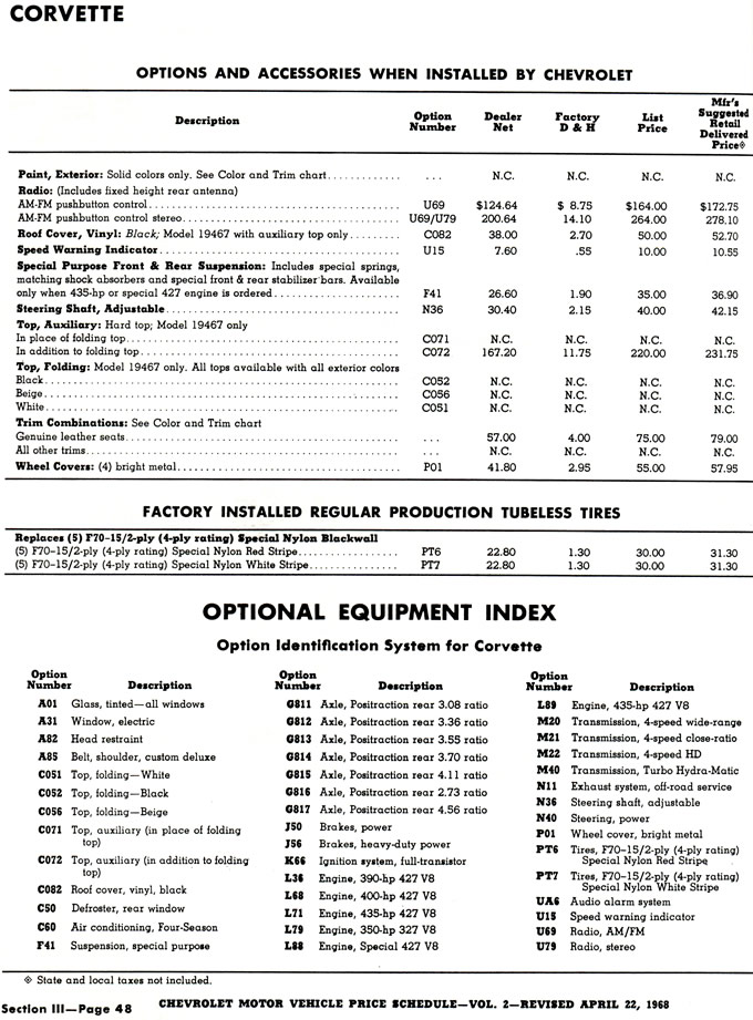 | Opt. No. | Dealer Net | Factory D& H | List Price | Mfr's Sugg. Retail Del. Price | |