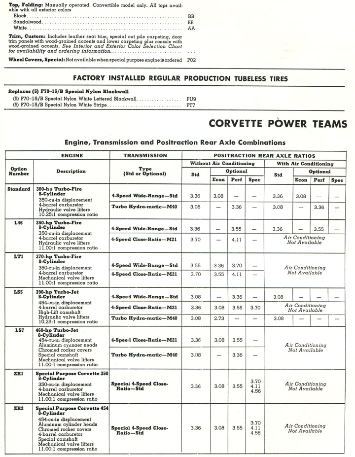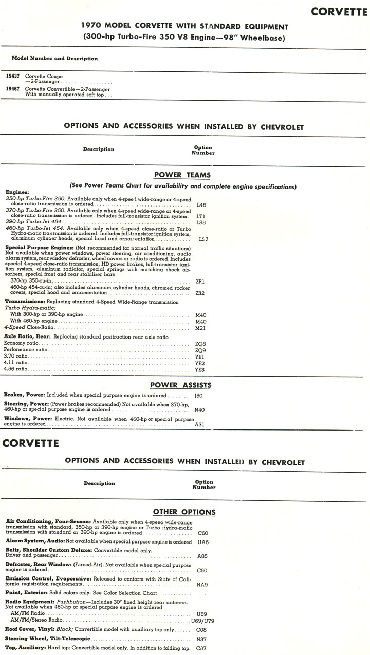 Below are 1970 Corvette specifications taken from 1970 confidential advance general information for 1970 Camaros and Corvettes from the Chevrolet Central Office Distribution Department.