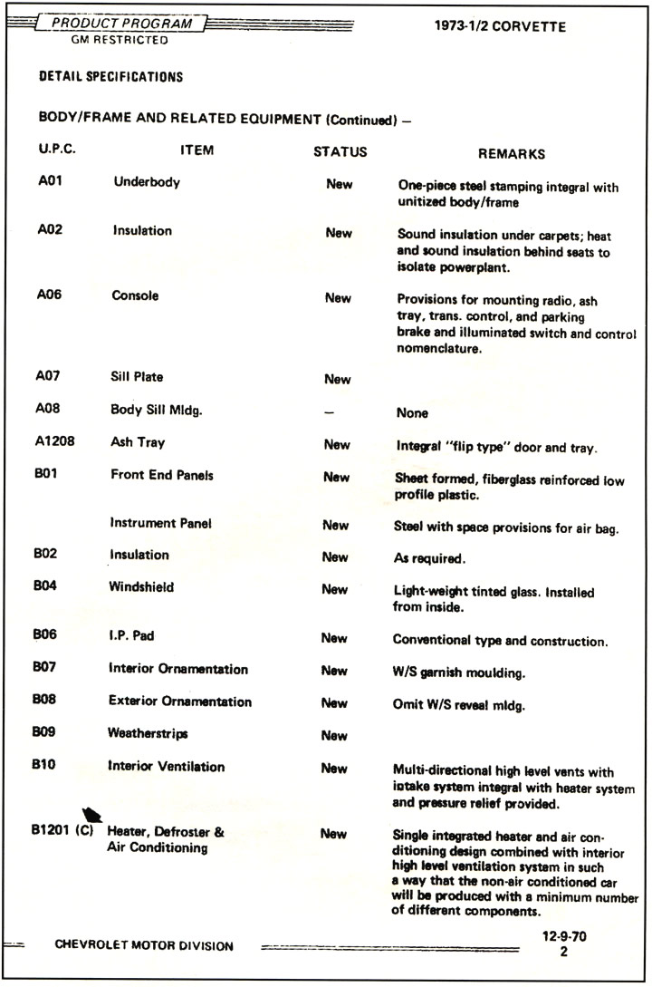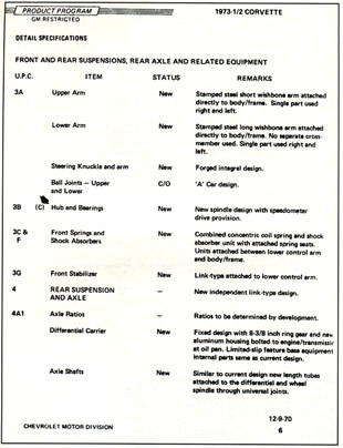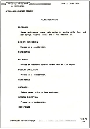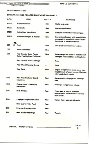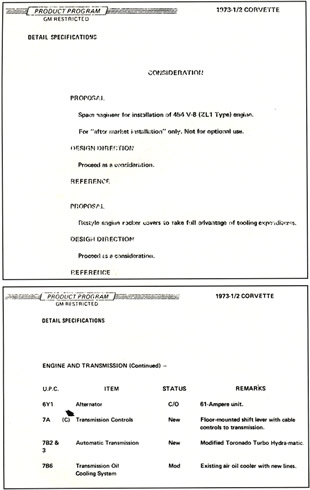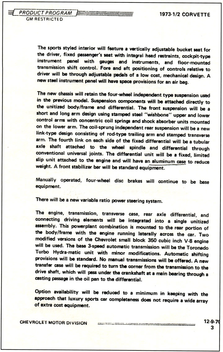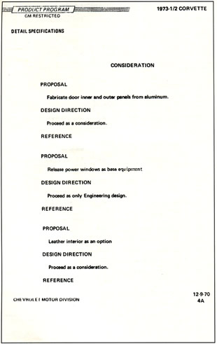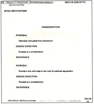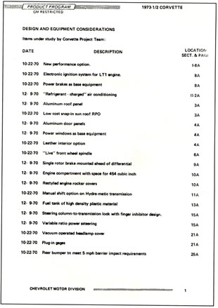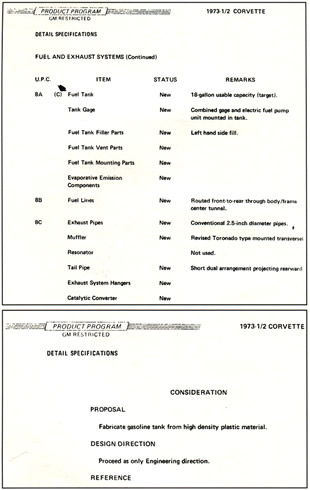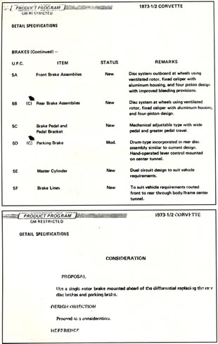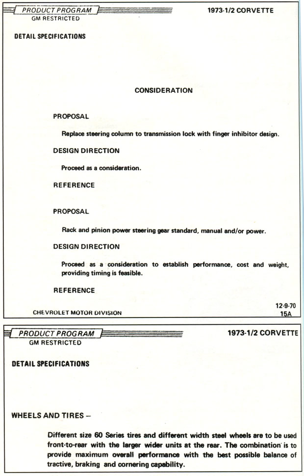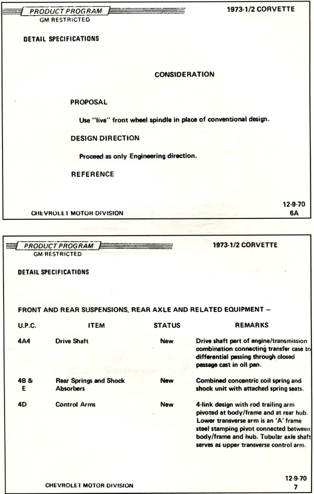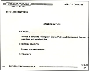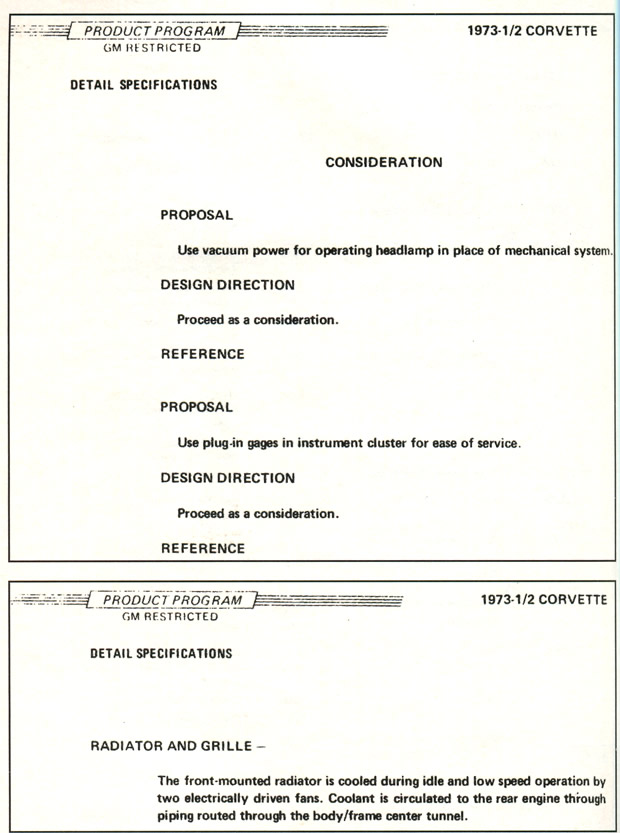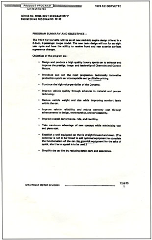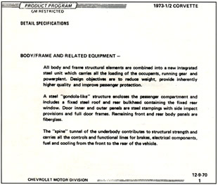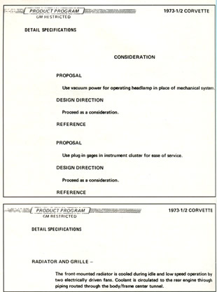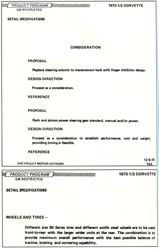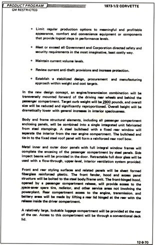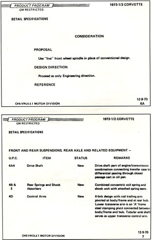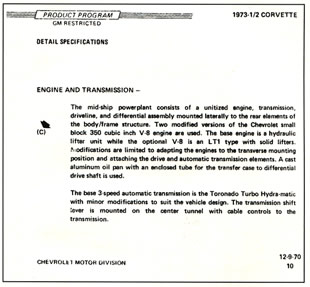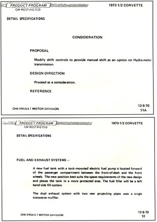 The Chevrolet Engineering documentation that outlines the development and specifications of the 1973 mid-engine Corvette is nearly fifty pages long and dated December 1970. Below is some of the documentation shown. Click on the individual images for a larger view.