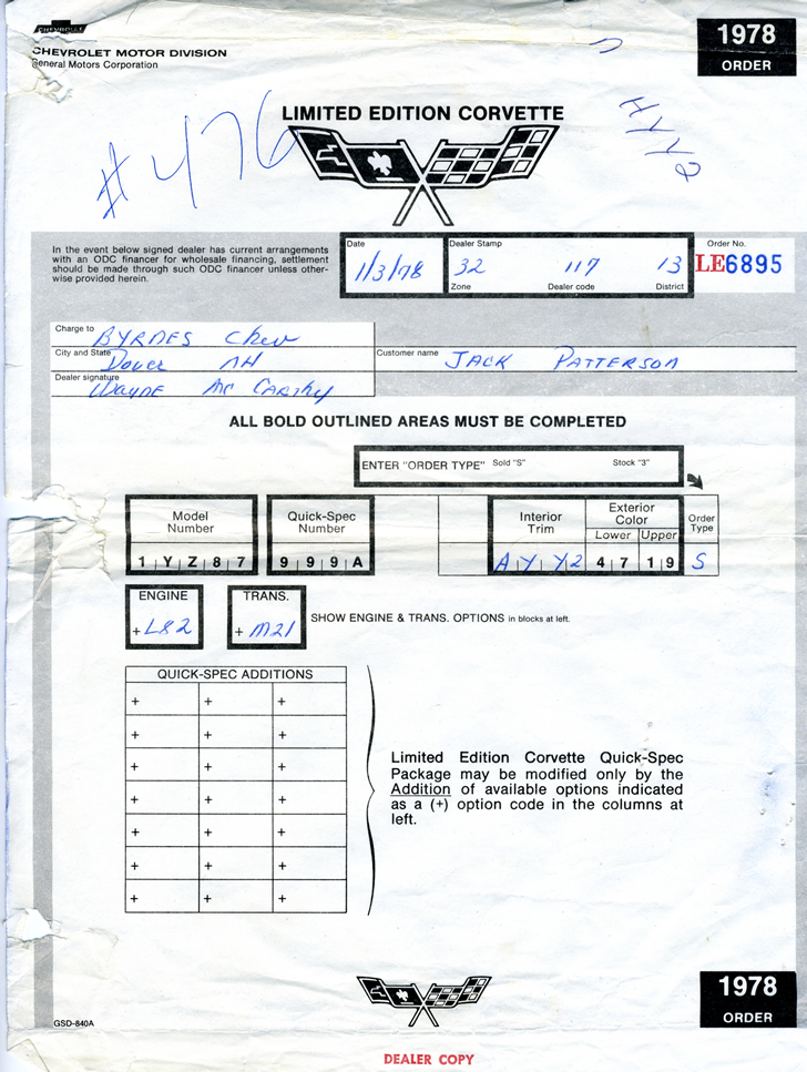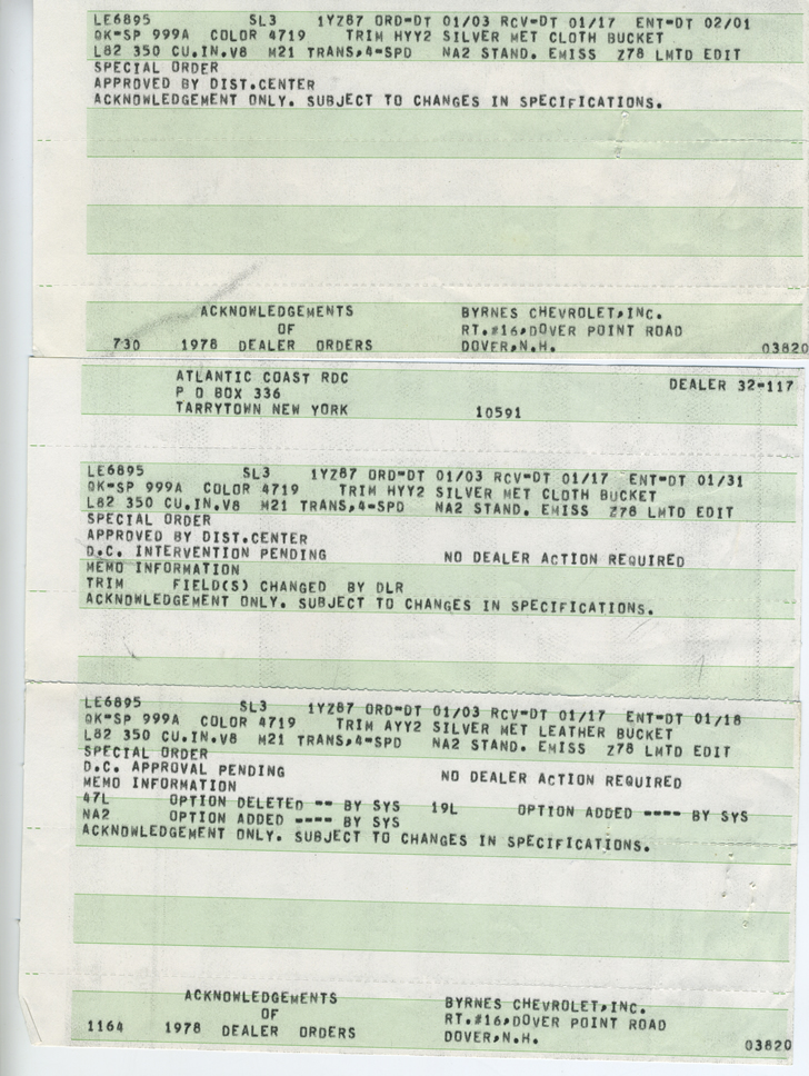 Dealers received pre-printed dealer forms, sequentially numbered from GM for all models. Special editions were exceptions such as the 1978 Pace Car and 1982 Collector's Edition. Note the dealer order number LE6895 (Limited Edition) and the dealer number and GM zone number. This set of numbers prints on all original vehicle documents.