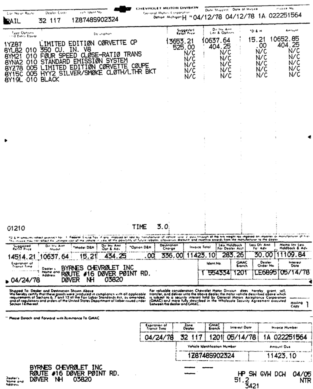 The dealer invoice shows a ship date and invoice date of 04/12/78 (top row) while the bottom shows an Expiration of Transit Time of 04/24/78. Assuming interior trim, marriage to chassis, testing, etc took another 1-2 days. This Corvette rolled off the factory floor approximately April 7, 1978, invoiced and shipped 04/12/78. Of course it is possible it was pulled for repairs which would have pushed completion closer to the 04/12/78 date. The buyer took delivery from the dealer 5/10/78.