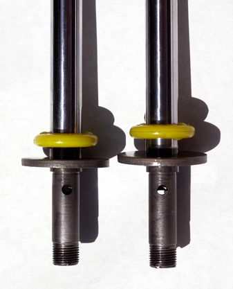 This bypass is a sleeve valve located at the bottom of the shock's piston rod. The tubular piston rod has a pair of holes in its wall, 180° apart. Concentric, inside that rod, is the valve shaft with a passage which runs vertically from its open end, up an inch or so, then T's to openings in the shaft wall which align with the holes in the piston rod.