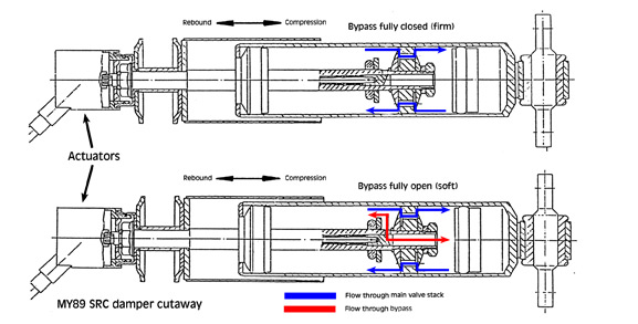 As the valve shaft rotates, the valve opening varies in size. The shaft is splined at the top and engages an "actuator," a bidirectional, DC motor with an integral, Hall-effect position sensor, which attaches to the top of the shock. The actuators are controlled by the SRC Module, or "controller", located in the well behind the driver seat. They rotate the bypass valves to one of a possible six discrete positions giving SRC up to six "steps" of damping. The position sensor feeds valve setting data back to controller.