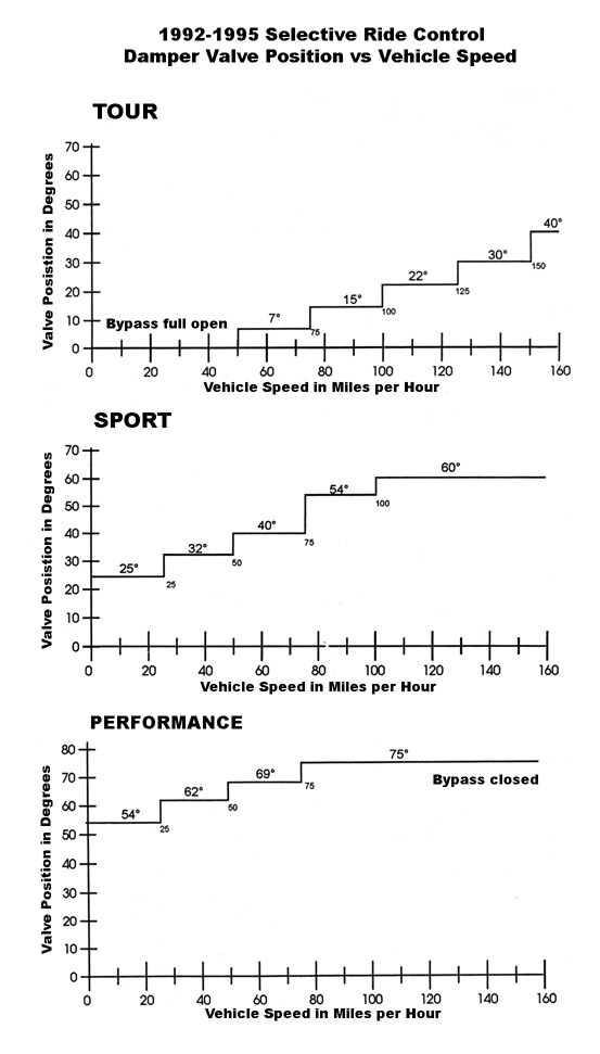 Selective Ride has two versions: '89-'91, "early", and '92-'95, "late". The late system has: 1) significantly less bypass (82° vs. 162°) travel. This quickened response because, while actuator speed was unchanged, the valves move half the distance, so they switch steps twice as fast, 2) two modes have less damping steps. Sport was cut to five steps and Performance was cut to four, 3) a revised controller, compatible with the changes in travel and steps, 4) a secondary valve stack in the bypass circuit which improves damping in the lower steps and 5) damping which is more aggressive overall because of lower spring rates for 1992.