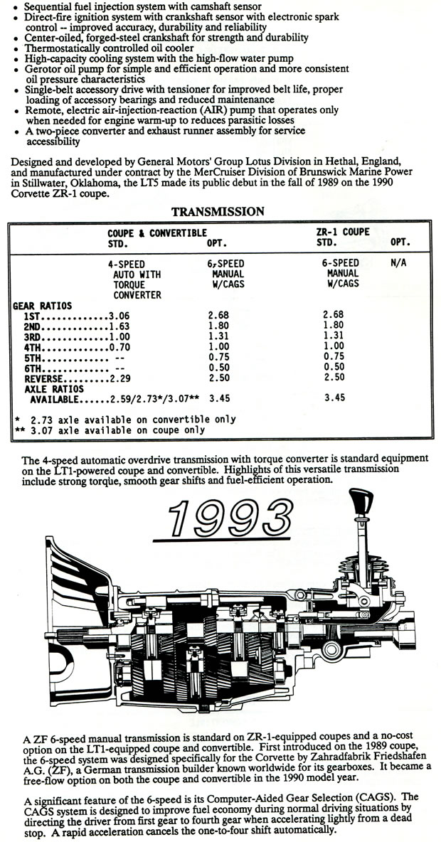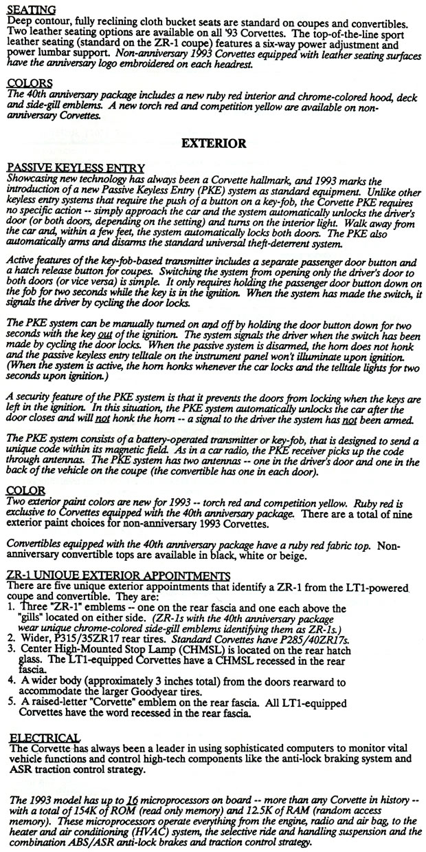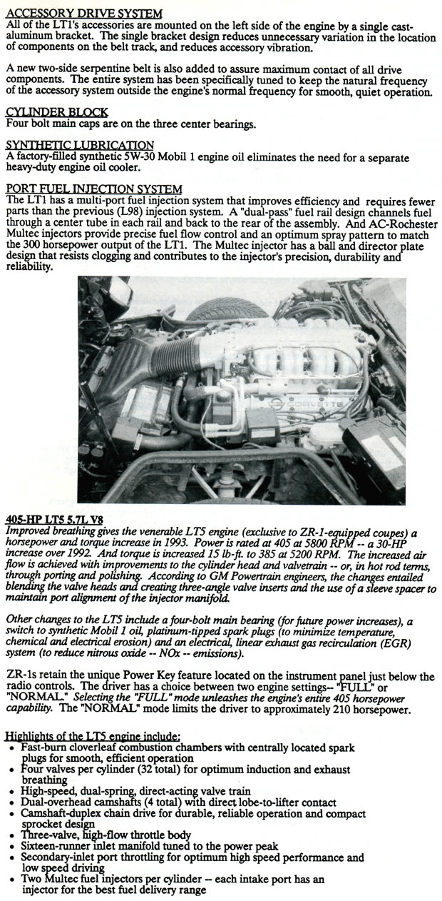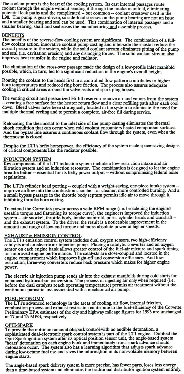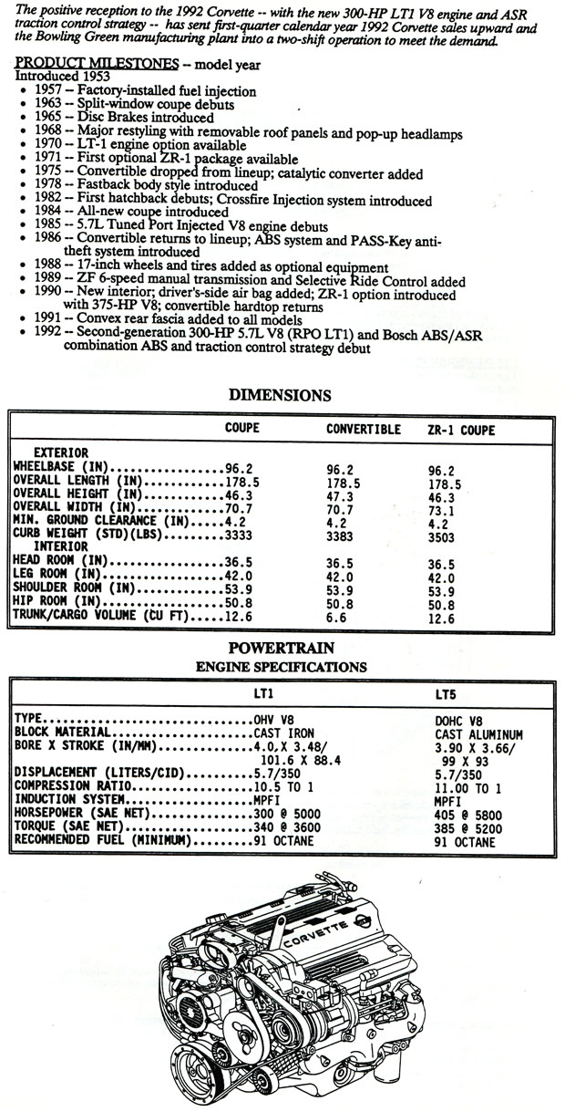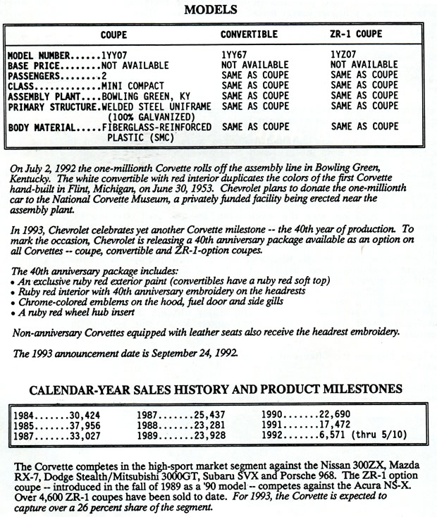 The following information below was presented to the media attending the long lead press preview for the 1993 Corvette LT1 and ZR-1 in Bowling Green, Kentucky held in 1992.