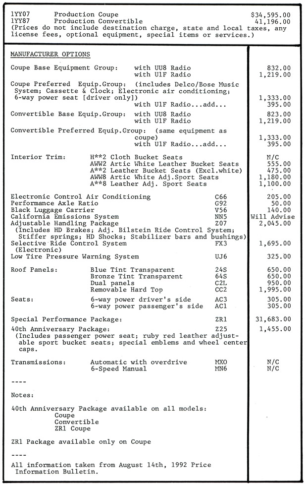 Pricing information for the 1993 Corvette taken from August 14th, 1992 Price Information Bulletin.
