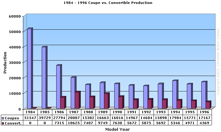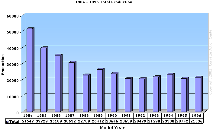 Below are statistical graphs showing total C4 Corvette production numbers from 1984 - 1996.