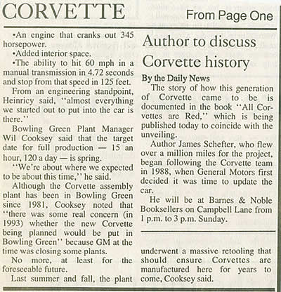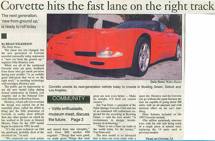 The following article on the introduction of the 1997 Corvette appeared in the Daily News, Bowling Green, Kentucky, Monday, January 6, 1997.