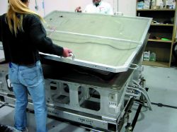 After application of mold release, the first two plies of prepreg are layed into the mold by hand, followed by the remaining four-ply preform. Source: MacLean Quality Composites