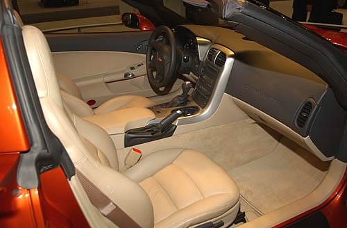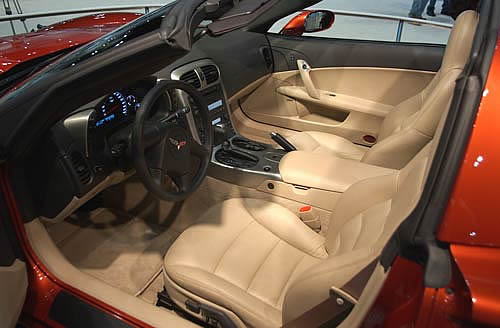 As I sat in the C6, I can't say I had a strong feeling of "precision" Chevy said I'd experience, but the interior does seem more spacious as well as looking brighter, modern and less-cluttered. The flush-fit radio and climate controls, the surrounding trim plates and the instrument panel-to-door closure are part of what gave me that feeling. The color of the interior we sat in was called "Cashmere". Also, available are Ebony, Steel Gray and Red.