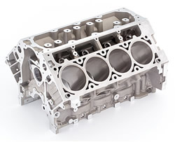 The LS3 case shares basics most aluminum Gen 3s and 4s have had since that engine family debuted in the 1997 Corvette: deep skirted, 319-T5 aluminum block with siamesed, cast-in-place, gray iron liners which are centrifugally-cast to increase density and allow thinner walls, long head bolts threading deep into its main bearing webs and six-bolt, steel main bearing caps. All this makes a lightweight, rigid, block structure offering good durability and reduced friction.