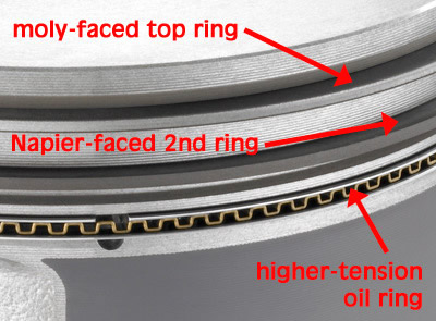 Oil control at high rpm has been a challenge with Gen 3/4 engines. Since 1997, to that end, GM has tried several combinations of crankcase ventilation systems and ring tension. While, for '08, the PCV caries over from LS2; the ring package has, once again, been changed. The top ring is still moly-faced steel and "coin twisted," which means its shape in side view is slightly conical to improve the ring's sealing when under combustion pressure. The second ring remains cast iron with the "Napier" face introduced in MY02 and they both are 1.5-mm. wide with the same tension as before. The oil ring is still three-piece, two rails and an expander, however, to improve oil control, for '08, its tension was increased.