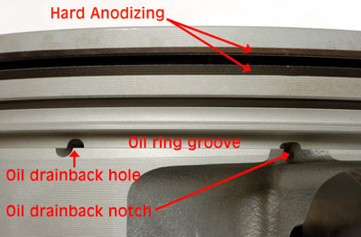 Ring grooves are machined with a slight upward tilt which was increased by 0.25° for '08. The top ring's tilt disappears as the ring land flexes under the pressure of combustion such that sealing and oil control are optimized. The other two grooves' tilt enhances the ability of the second ring and the oil ring to scrape oil off the cylinder walls. To further improve oil control, the LS3 piston has four holes drilled in its skirt, just below the oil ring groove downwards into its interior. These holes, two adjacent to the major thrust surface and two adjacent to the minor thrust surface, improve oil drainage from below the oil ring.
