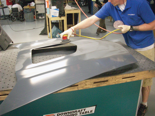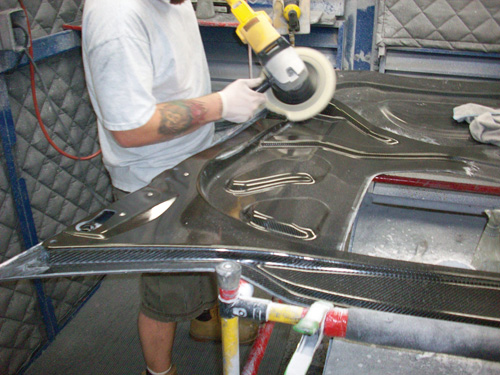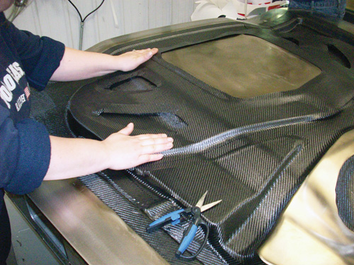 Each hood is 100-percent hand finished. Trained technicians sand the outers and hand-polish the inners to a diamond-like finish, giving it the look of a clearcoat without the expense of the extra step. Then, the inner panel is masked, the assembly is passed through Plasan's primer booth and, when cured, the primed hoods are shipped to Creative Liquid Coatings (Ft. Wayne, Ind.) to be painted. Just before final quality-control inspection, the polycarbonate window is joined to the hood assembly. To accommodate the coefficient of thermal expansion (CTE) mismatch between the CFRP and the PC, technicians use a special compliant shear/ductile urethane adhesive, also provided by Ashland. In what has been described as the only real challenge encountered in the window's development, early installs had a few tiny leaks as the team learned to use the adhesive and equipment, but the problem was soon eliminated.