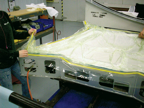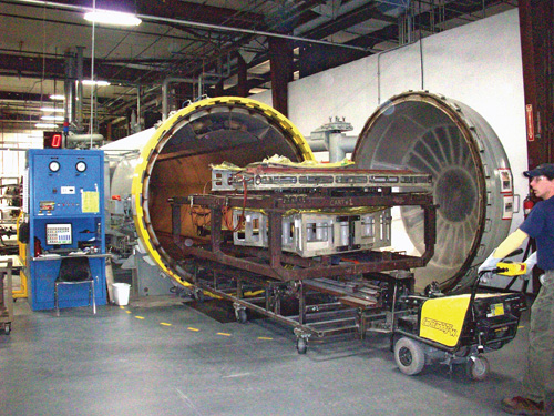 When layup is complete, the parts are vacuum bagged and moved to one of Plasan's four production-size autoclaves where, thanks to ACG's fast-cure epoxy, they cure in about 10 minutes. The total production cycle time for a hood, from layup through cure, is about 60 minutes.
