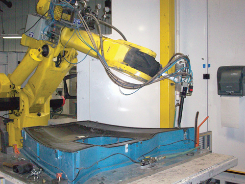 Next, the hood inner and outer panels are prepped for adhesive application and placed in a bonding cell. Here, they are robotically bonded around the perimeter edges using a two-part structural urethane specially formulated by Ashland Inc. (Dublin, Ohio) to cure quickly, survive paint-bake oven temperatures and exhibit the high strength necessary to prevent debonding of inner and outer panels under the stresses of high-speed operating conditions.