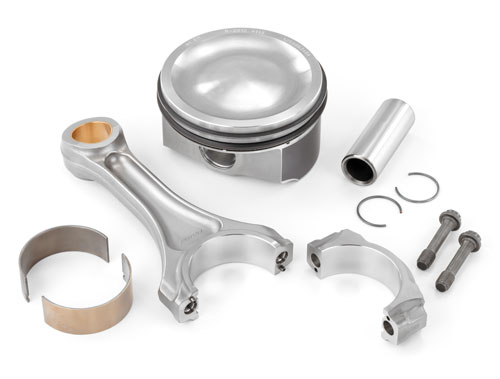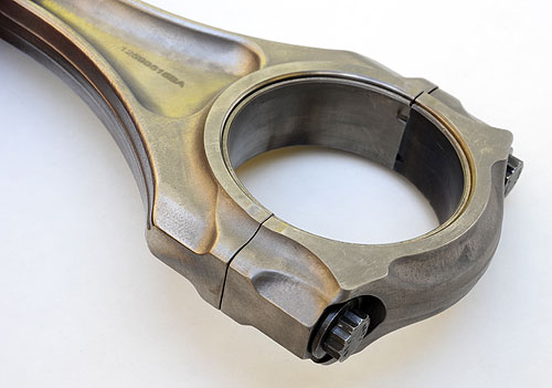 The connecting rods are titanium forgings which offer a 31% mass reduction over forged steel rods. QRD drove the use of a "ti" rod. "In order to keep the bearing loads acceptable," Ron Meegan stated, "we needed to keep the reciprocating mass (of the rod/piston assembly) the same as the LS3. Since we beefed-up the piston due to the combustion loads and that increased its mass, we accomplished a mass equivalent to the LS3 parts by reducing the rod mass through the use of titanium."
