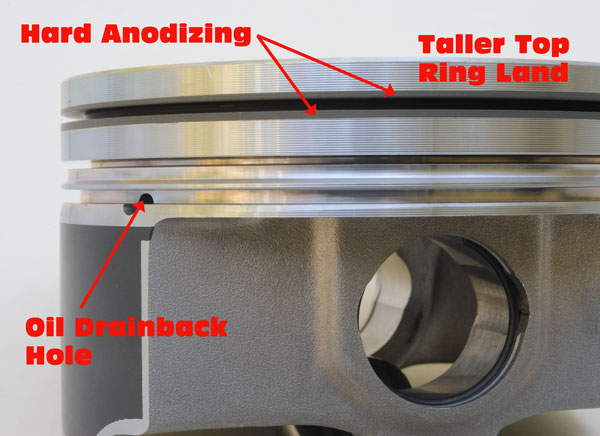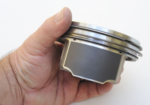 Another difference in the LS9 piston is that the top ring land is wider, an upgrade required for "QRD" (quality/reliability/durability) at the 638-hp level. Specifically, the extra width prevents deflection of the top land. As the piston nears TDC on the compres-sion stroke, the spark comes, air-fuel charge starts burning and compression pressure builds behind the ring, pushing it hard against the cylinder wall. As the piston starts down on the power stroke, the ring with all that pressure behind it, "wants" to remain stationary and that can hammer the top ring land upwards. A wider land prevents ring land deflection or hammering. The durability-enhancing, hard-anodizing of a small width either side of the top ring groove introduced on the LS3 piston carries over to the LS9's forged piston.