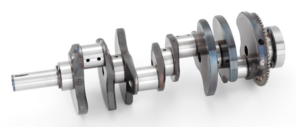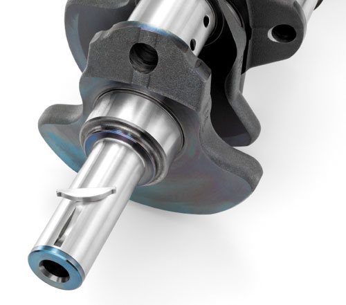 The crankshaft is definitely a high-end piece for a production engine. It's an air-cooled forging of "46MnVS6", a manganese-vanadium based, high-grade, micro-alloy (0.42-0.49% carbon) steel, rather than the nodular cast iron crank used in LS3. This part is sourced from Saarsthal, a German steel-making firm. It has a nine-hole flywheel mounting flange, as opposed to the six-hole flange of other Gen 3/4 engines. Because the LS9 makes 604 lbs/ft torque, extra bolts are required for reliability/durability reasons. To accommodate the keyed harmonic damper/drive pulley assembly, a keyway is machined in the crank snout.