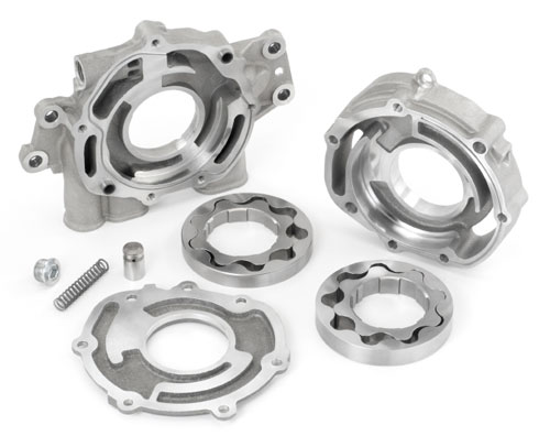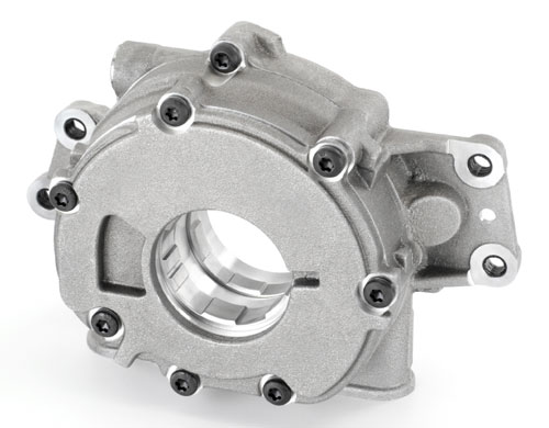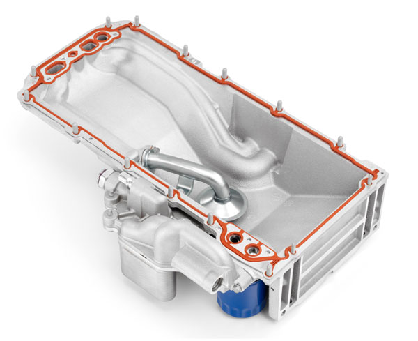 The LS9, because it has a dry sump, uses two-stage oil pump, similar to the LS7 unit, however, its capacity is larger, 32.3 gallons-per-minute vs. the LS7's 27.1 gpm. The oil pan comes from the LS7 but has mounting bosses for the ZR1's engine-mounted, oil cooler.