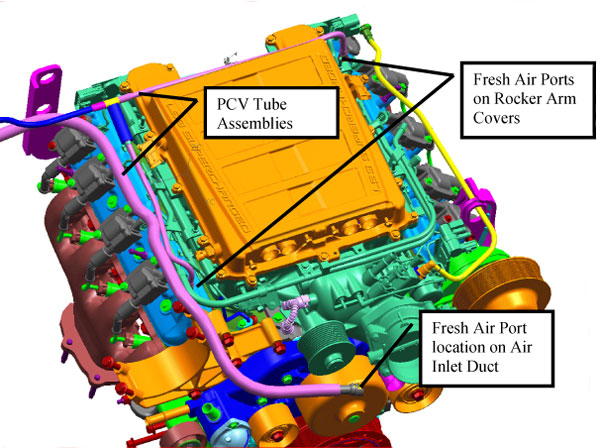 The LS9's PCV hardware builds on the LS6, LS2, LS3 and LS7 designs. A discussion of both the LS2 and LS3 systems can be found elsewhere on the CAC. Both the "foul" (normally flows from crankcase to intake) and the "fresh" (normally flows from just downstream of the air filter to crankcase) sides of the system have air-oil separators. On the foul side, that's a given, but, because flow through the fresh side can reverse at WOT and high rpm, in a practice that began with LS2; air-oil separators are used on the fresh side, too. They're located inside each valve cover.