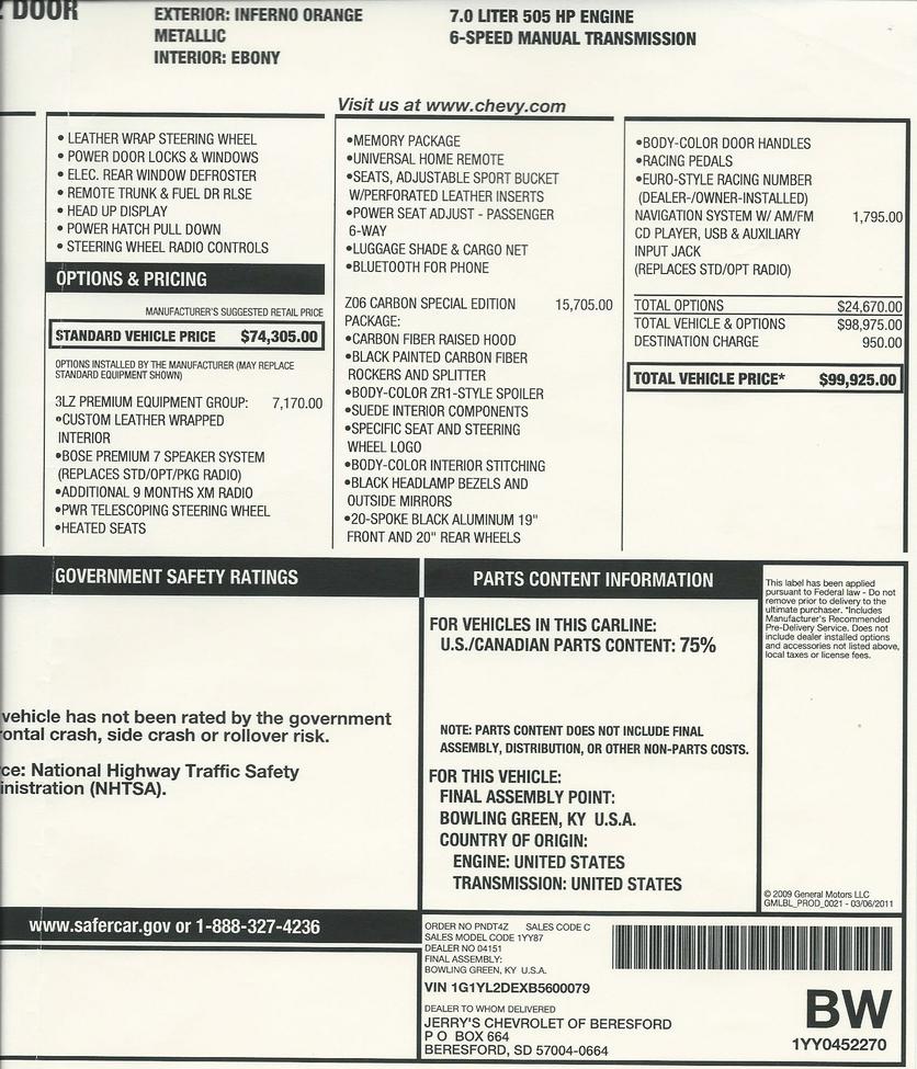 1YY87 CORVETTE Z06 2 DOOR 74305.00 67617.56 INVOICE 03/29/11