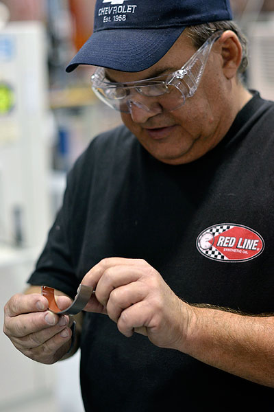 So, you're wondering-how does a bearing shell with a little fleck of a high spot get though? I'm glad you asked because, I was the guy who inspected all the main and rod bearing shells before my engine assembly began. Reality is: no way could anyone see a .001-.002-inch high-spot in the coating. To have found it, we would have to have been measuring the thickness of the entire surface of each bearing with a micrometer-obviously impractical, even at the PBC. The only way such a problem could be detected is exactly the way we found it-experienced engine assemblers, like Mike Priest, turning the crankshaft by hand and feeling a slight resistance.