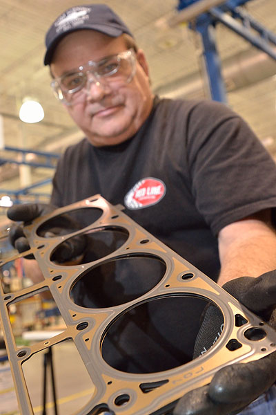 The heads and multi-layer steel head gaskets have edges so sharp, at the PBC, you're required to wear special gloves when handing them. We guest engine builders are given a pair of black, nitrile-butadiene-rubber-impregnated fabric gloves, which are resistant abrasions and cuts, and have to wear them during the head assembly portion of the build.