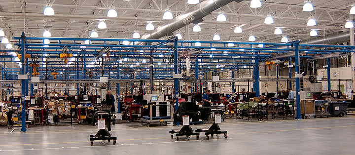 The facility has three assembly areas, each arranged in a U-shape and divided into 15 stations. Each station contains the workspace and specialized tools needed for one specific assembly procedure. Engines are moved from station to station on a "cart"–an industrial-strength engine stand with locking wheels. Adjacent to these assembly areas is a large parts stock, "cold test" and "hot balance" cells along with a shipping/receiving area.