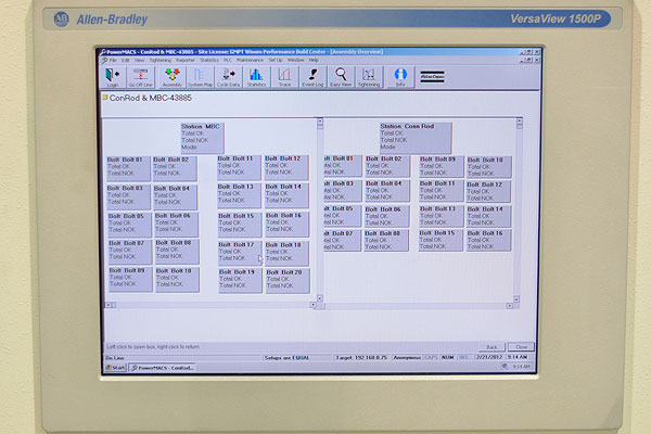 Electronic monitoring of fastener installation and computerized record keeping are key components of the quality effort at the PBC. The majority of fasteners are tightened with power-operated, torque- or torque-angle-sensing, data-recording "wrenches". The builder positions the wrench and controls its operation, but physically applies no torque. The power-driven wrench senses torque applied or the amount the fastener is turned. If the proper torque or torque angle has been achieved, a green indicator light comes on and the wrench sends tightness data to the Performance Build Center's computer system which has a record of most of the bolts and nuts on each of the engines PBC has built since it opened.