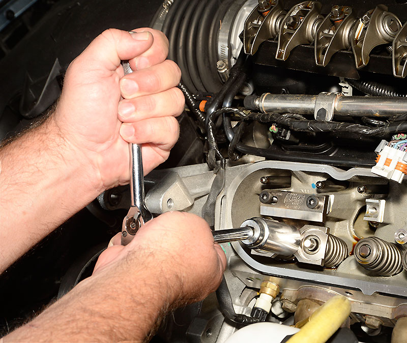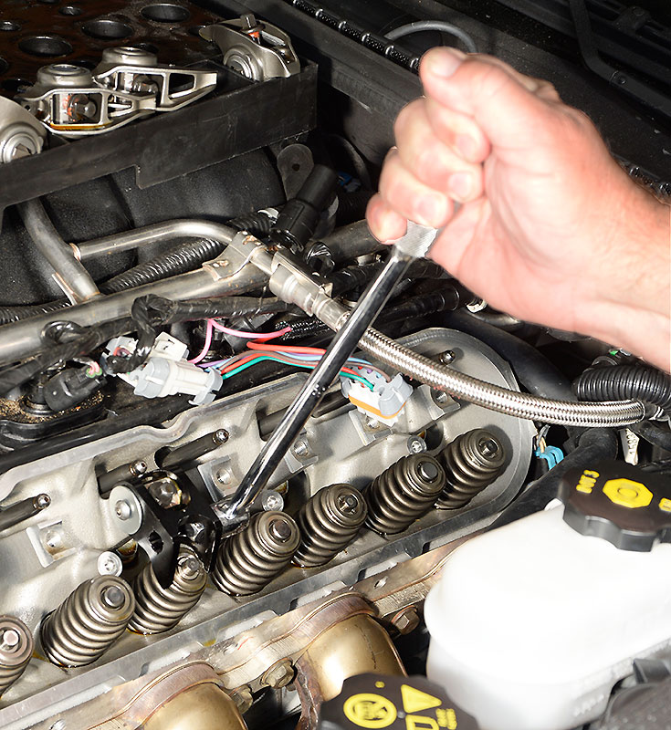 Start with the intake valve. To use the Lingenfelter compressor on offset intake rocker arms, set it on the rocker mount, twist the tool such that it aligns with the valve spring retainer then make the bolt finger tight. The load of spring compression is applied to the bolt in tension, so having the tool's pivot centerline at an angle to the rocker mount is not a problem. Attach a long-handle ratchet or a breaker bar and pull down on the handle-a lot of strength is not required-such that the retainer is depressed enough for you to remove the valve locks with a magnet. When you pull down on the compressor, if the valve goes down, too, release the pressure, loosen the rocker bolt and turn the tool out of the way. Pick a socket about the same diameter as the retainer, seat it on the retainer and give it a modest whack with a hammer. That will usually free the locks in the retainer. Recompress the spring, remove the locks, release the compressor and remove the retainer and spring. When you do an intake, the lash cap may come off with the retainer. We kept the locks, retainer and lash cap in a small plastic cup until we needed to reinstall them. Now, move the LPE spring compressor to the exhaust valve. Compress the spring, remove the locks then, release the pressure and remove the spring and retainer.