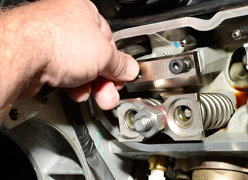 Observe this note of caution about the Lingenfelter Spring Compressor: be carful when compressing the spring to remove the locks and when compressing it again to reinstall the locks. Because the retainer moves in an arc, if the tool is not positioned properly on the spring/retainer package before compression, it's possible to scrape the valve stem with the edge of the retainer's inside diameter. As the spring nears full compression, carefully, observe the retainer I.D. as it descends. If it's too close to the stem, release pressure and reposition the compressor. If you score an exhaust valve stem, it will have to be cleaned-up with a fine abrasive; but if you score an intake valve stem, you destroy its CrN coating and and the valve must be scrapped. Given the cost of titanium intake valves, do the utmost to avoid stem damage. This problem is why we prefer the LSM Spring Compressor which Summit Racing sells, in spite of its significantly higher price.