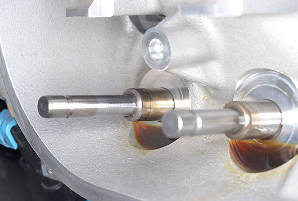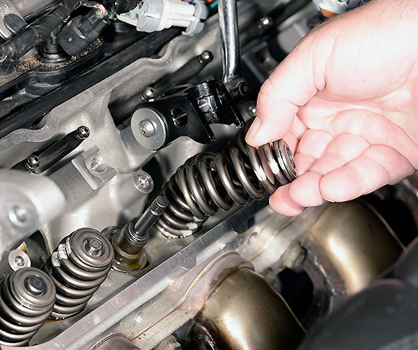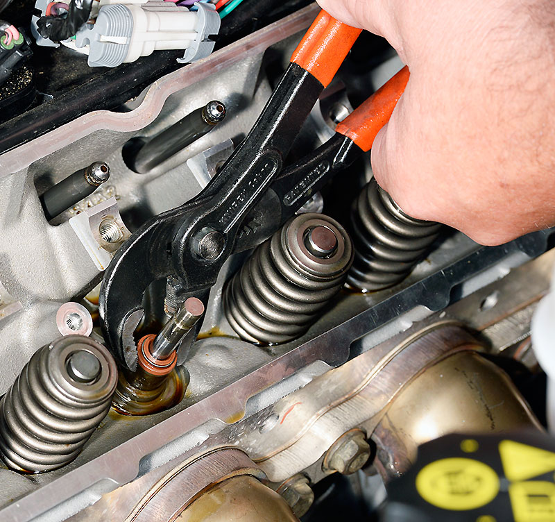 With the springs out of the way, disconnect the air pressure then, use slip-joint pliers-we like 10-in Knipex (PN 8701250) for this-to gently work the valve stem seals loose from the spring seats in the heads and remove them. With the piston at TDC, the valves will drop slightly until their heads sit on the piston top. Now you're ready to wiggle.