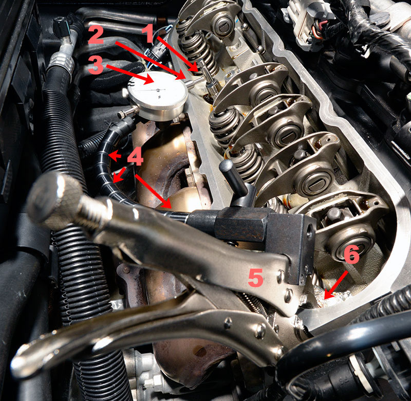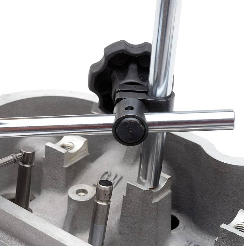 The vertical support beam of many foreign-made indicator bases has the same, M8x1.25 thread as an LS7 rocker arm bolt, so the post can be unscrewed from the base and installed directly onto the cylinder head by threading it into a rocker arm bolt hole. Tighten the vertical beam so it's snug but not tight enough to deform the rocker arm mount, then install the horizontal support beam and, finally your measuring device.