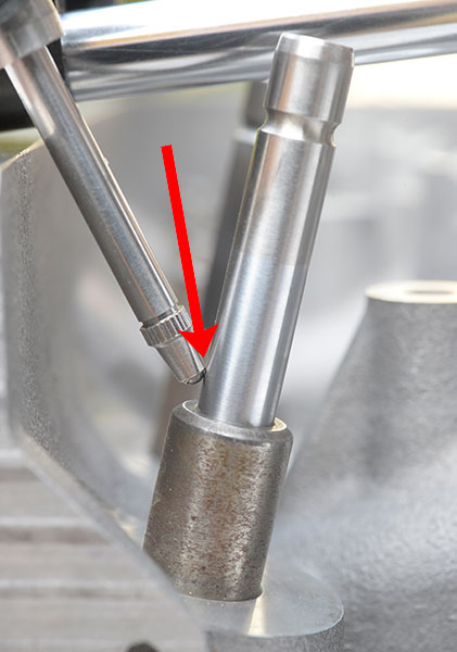 In a "perfect storm" situation, where all these errors happen and are cumulative, indicated guide clearances can be larger than actual clearances. For example, using the errant indicator set-up we found on the Corvette Forum, we measured the guide clearance of the #6 intake valve on the engine in the CAC's longterm test Z06 a number of times. It was anywhere from .0032" to .004" and the readings did not repeat consistently. For most measurements, we saw .004", but there were others at .0032" and .0037". Conversely, using the "test indicator method," discussed later in this article, we consistently measured .0025" and we know that is accurate because, in researching the CAC's main LS7 article from which this article linked, when the same head was apart, our head service vendor, DeGroff's Cylinder Head Service in Northridge, California, measured that same valve guide with a Sunnen dial bore gauge and it read .0026" clearance.