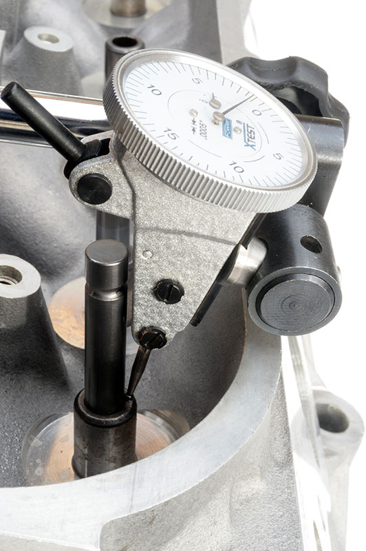Earlier, we mentioned using a test indicator rather than a dial indicator. The beauty of the test indicator is that it can be positioned in a manner that allows direct and accurate measurement of stem-to-guide clearance right at the top of the guide. The nice thing about measuring there is no computation is necessary to derive the clearance number and there is no error introduced if you inadvertently bend the valve stem. Don't laugh. You'd be surprised how easy it is to bend the valve stem half-a-thousandth of an inch.