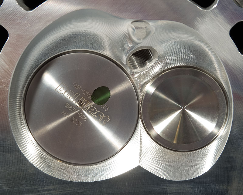 "We started with a hollow-stem, steel valve, kinda like the LS6, with a very thin head, "Hicks said. "We reached a point where the power the engine was making was flexing the valve head enough that we had problems with the valve heads cracking. Combustion pressure causes the valve head to flex. Imagine pushing on the top of a tin can, moving it in-and-out. If the section (thickness of the valve head) gets too thin relative to the amount of pressure in the chamber, you'll get this flexing and, eventually, a pie-shaped section breaks off. We found this with test engines. At the time, we were, also, doing some work with Katech. They were using a lot of our parts in the World Challenge, the first year of the Cadillac CTS-V program and they failed some of our valves, as well.