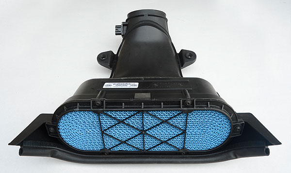 The air filter assembly designed for the LS7 also holds the mass airflow sensor. It is a low-restriction design with a filter element held by a retainer which screws in place. The filter assembly connects to the engine via a duct or "air bridge." Up until 2012, the filter was a Donaldson "PowerCore" type filter. To reduce restriction and gain back the slight loss in performance forced by the "four cat" exhaust system mandated for 2012 and 2013 by new emissions requirements in California, LS7s were upgraded with the LS9 air filter element which uses the newer, "PowerCore G2" filter media.