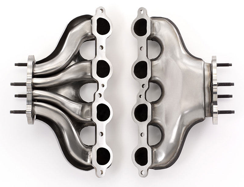 The LS7's exhaust manifolds are the most efficient ever used on a production GM V8. They are a two-piece, stainless steel design consisting of a fabricated, stainless steel "shorty header" style manifold, surrounded by a bolt-on or, later, welded-on, hydroformed outer shell which keeps heat in the manifold aiding quick cat light-off. The four, hydroformed primary pipes meet at the manifold's outlet flange. The end of each pipe is a rectangle and are arranged in row which smooths the exhaust flow at the outlet and into a "wide-mouth" catalytic converter. This design contributes to the Z06's low level of back-pressure.