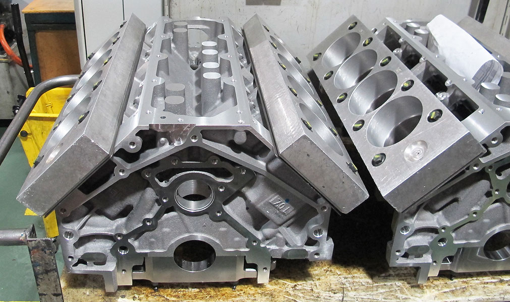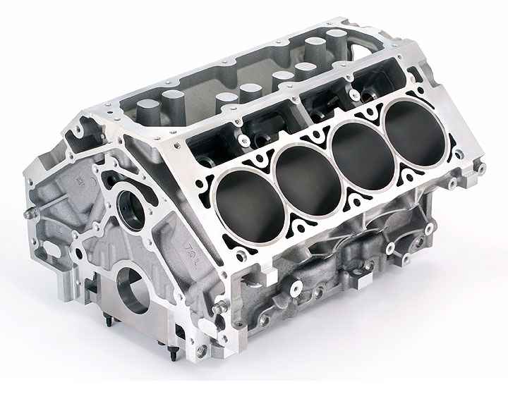 GM's production, aluminum V8 bare blocks, or "cylinder cases" are cast by Nemak, a world-class foundry in Monterrey, Mexico, which supplies engine manufacturers world-wide. The LS7 case shares qualities Gen 3/4 engines have had since their 1997 debut: deep-skirted, 319-T5 aluminum block, long head bolts threading deep into its main bearing webs, six-bolt main bearing caps, a center thrust bearing and gray iron liners which are centrifugally-cast for increased density to enhance strength and allow thinner cylinder walls. All this makes a lightweight, rigid, block structure offering good durability and reduced friction--all important basics for a specialized engine like the LS7.