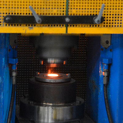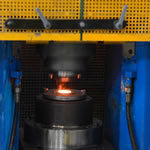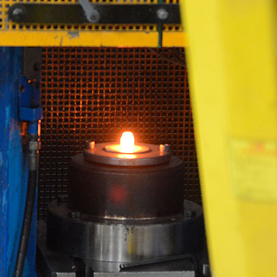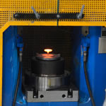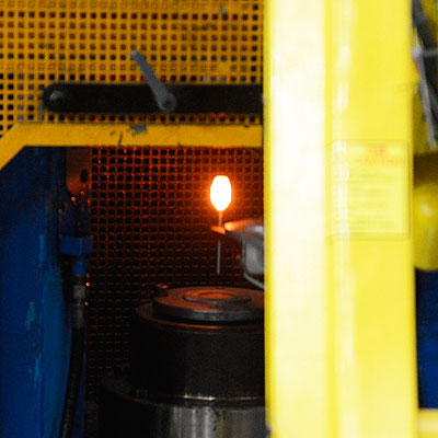 At this point the valve-to-be is just a short titanium rod. The robot places the rod in a fixture which passes electrical current through one end heating it until that end glows bright yellow. The fixture also forms the glowing end into a blob. Then, the robot picks the part out of the heater and places it, stem down, on one half of a forging die housed in a press adjacent to the furnace.