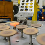 BAM! The other half of the die hits the glowing blob with 30-tons pressure, forging the valve head. You can feel the impact through the floor The robot picks the red hot valve out of the press and sets it in a cooling tray. The tray of valves is moved to an area where they are machined by robots with the last step grinding the 45° face. Then the valves are polished.