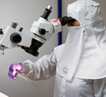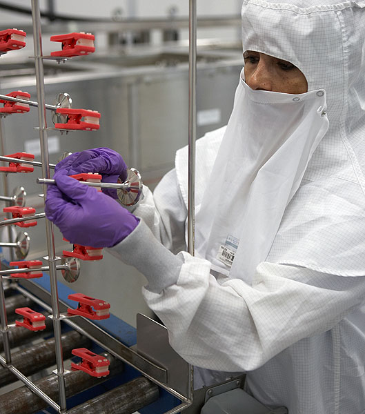 Now comes the hard part: applying the chrome-nitride (CrN) coating. One stringent requirement of the coating process is absolute cleanliness. First, the valves are moved into a "clean room" where the air is dust-free and everyone wears white suits covering everything except part of their faces. In the clean room, the valves are run though a four-step cleansing process with every step having a rinse between the next wash. After washing, the valves are hung in metal "trees".