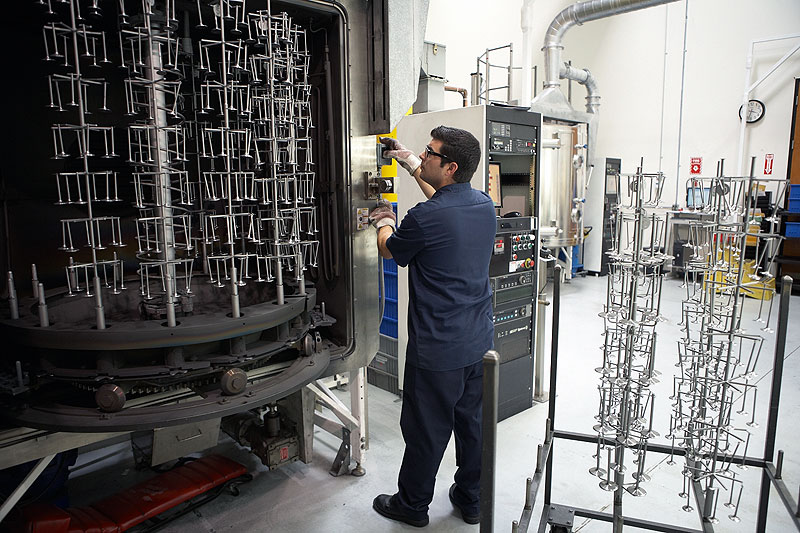 The trees are moved into a 1.5-cubic-meter physical vapor deposition (PVD) chamber which applies the CrN coating. Inside the chamber is a big metal coil with a chrome bar through the center. The trees rotate one direction and they move in a track around the coil in the opposite direction. A voltage is applied to the center coil which causes arching and vaporizing of ions off the chrome bar. This occurs in a low-pressure nitrogen atmosphere. The chrome ions react with the nitrogen and a four micron (about .00016-in) chromium-nitride (CrN) coating is deposited on the valves very slowly. Each batch of 400 valves takes eight hours.