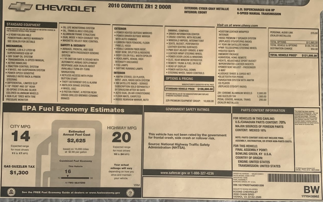 2010 Corvette ZR1 - Number 1208 - Window Sticker