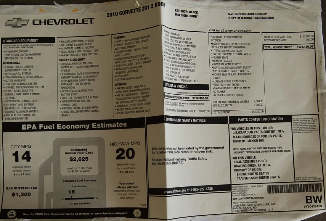 1YY87 CORVETTE ZR1 2 DOOR 106880.00 99932.80 INVOICE 04/20/10