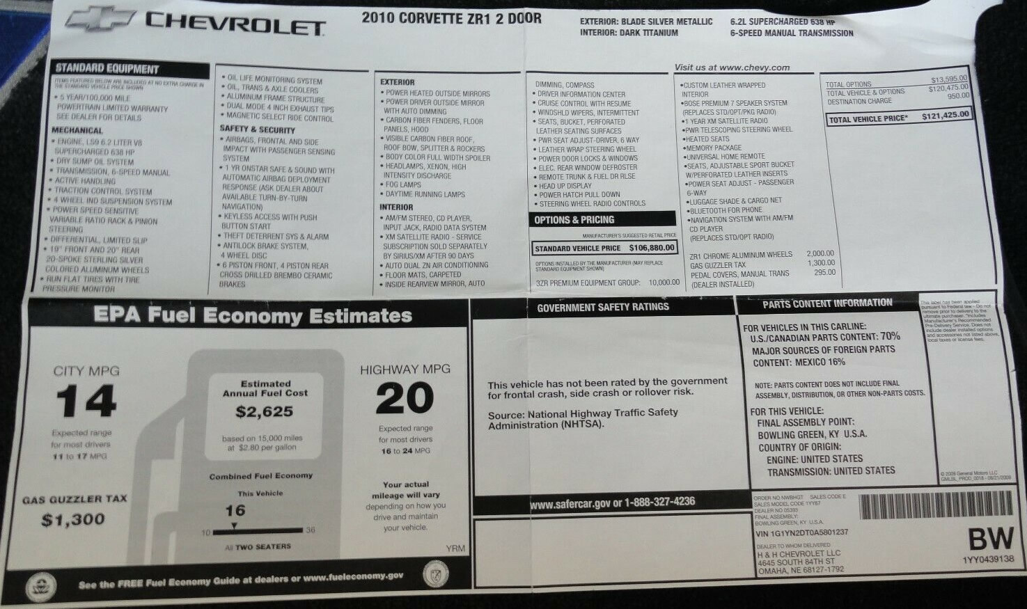 1YY87 CORVETTE ZR1 2 DOOR 106880.00 99932.80 INVOICE 04/20/10