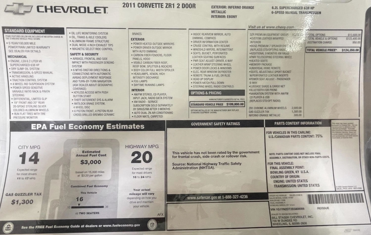 2011 Corvette ZR1 - Number 9 - Window Sticker