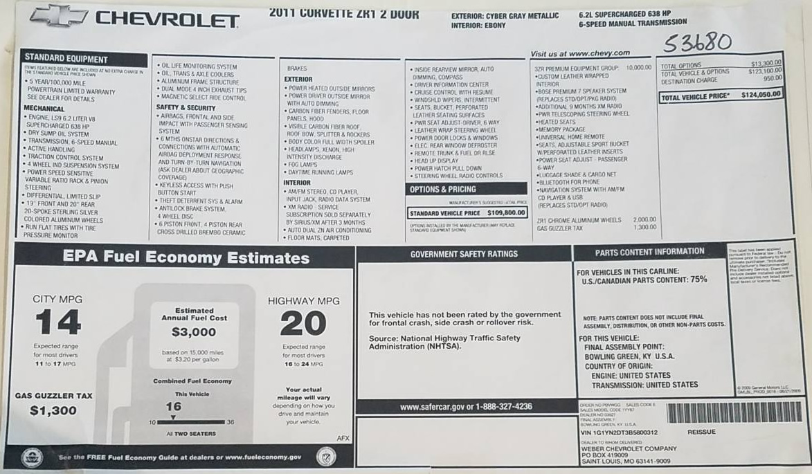 1YY87 CORVETTE ZR1 2 DOOR 109800.00 102663.00 INVOICE 08/03/10